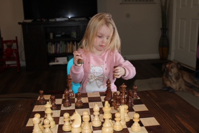 She began to learn the names of the pieces by age two. By age three she was able to set up the chess board unsupervised. She began to learn the rules of chess and play a legal game of chess unsupervised by age four.